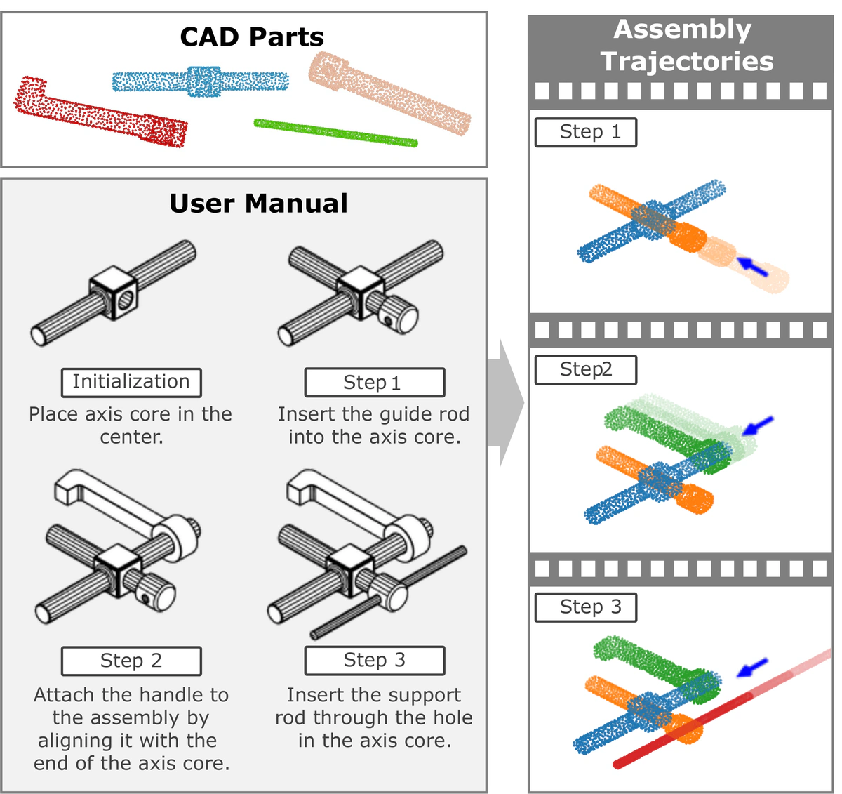 给定带有图示与文本的分步说明书(左下)以及对应的 3D 零件集合(左上),我们在虚拟环境中执行装配,并输出逐步装配轨迹,可渲染为 4D 动画(右侧)。从零件装配物体需要理解多模态说明,将其与3D组件关联,并为每个装配步骤预测物理上合理的6自由度运动。现有数据集多聚焦于简化场景,忽视了工业装配中的形状复杂性和装配轨迹。我们提出AssemblyBench,一个包含2,789个工业对象的合成数据集,提供多模态说明手册、对应的3D零件模型以及零件装配轨迹。我们还提出基于Transformer的模型AssemblyDyno,利用说明手册与各零件3D形状联合预测装配顺序和零件装配轨迹。AssemblyDyno在装配位姿估计和轨迹可行性两方面均优于先前方法,其中后者通过我们基于物理的仿真进行评估。